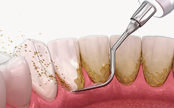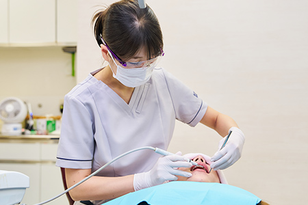 手動または超音波式のスケーラーと呼ばれる専用器具を使って、主に歯の表面や歯と歯ぐきとの境目についた歯垢・歯石をきれいに除去します。処置後は、汚れや歯垢が再びつきにくいよう、歯の表面をツルツルに仕上げます。歯周病の改善はもちろん、むし歯予防にも役立ちます。