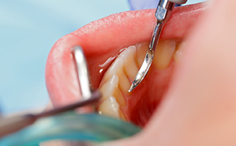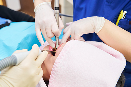 主に歯の表面についた汚れを除去するスケーリングと、歯と歯ぐきとの間にある歯周ポケット内の歯石などを除去するルートプレーニングを組み合わせて行う、歯周病の基本治療です。汚れを取り除いた後は、再び汚れがつきにくいように表面を滑らかに仕上げます。