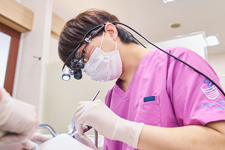 肉眼の約20倍まで視野を拡大できるマイクロスコープを導入し、精密な歯周病治療を行っています。従来の治療は手探りの感覚に頼る部分もありましたが、顕微鏡下では歯周ポケットの奥深くにある微細な歯石や歯垢を直接「見て」確認することができます。原因を徹底的に除去することで再発リスクを抑え、大切な歯を保存できる可能性を高めます。