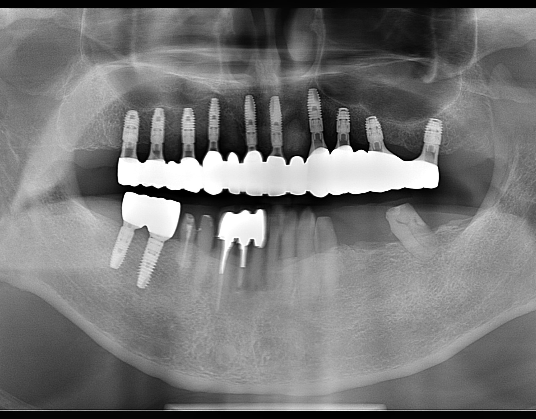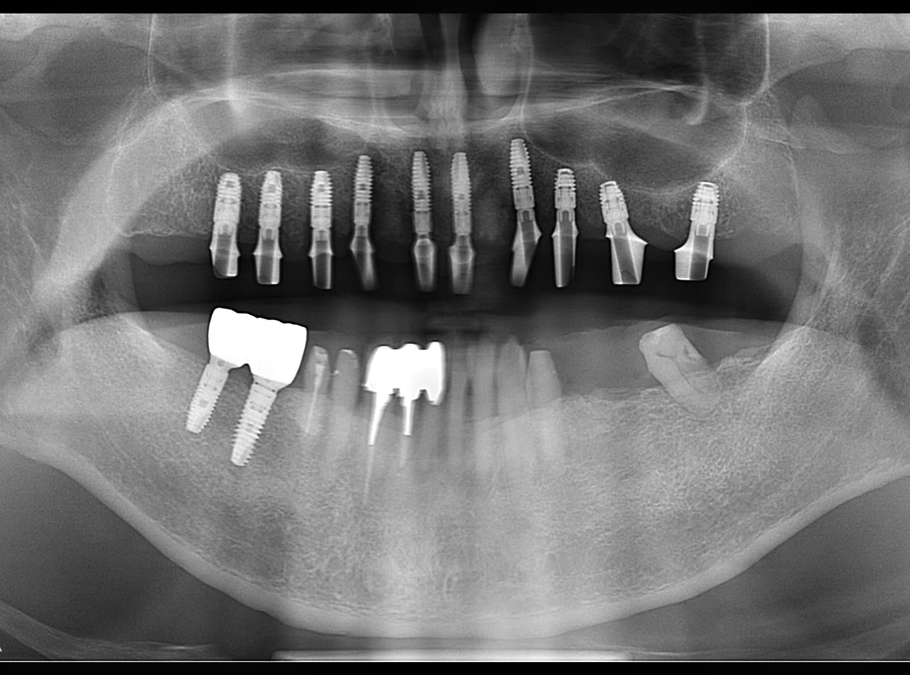この患者さんは、総入れ歯ではなく、固定式のボーンアンカードブリッジを希望され、昨年末に1回の手術で10本のインプラントを埋入しました。